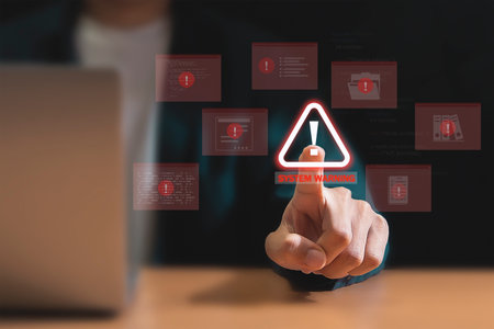 System Warning Alert and Cybersecurity Threat Concept. A person using laptop with system warning and exclamation triangles red, symbolizing cyber security alerts, system failure, and critical threats.