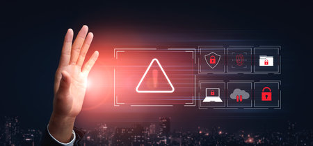 Cyber security alert concept showing a person touching red warning triangle with exclamation mark symbol representing danger, system failure, risk notification, caution and online safety technology.