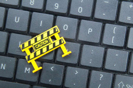 Digital Security Warning: Miniature Caution Barrier on White Computer Keyboard