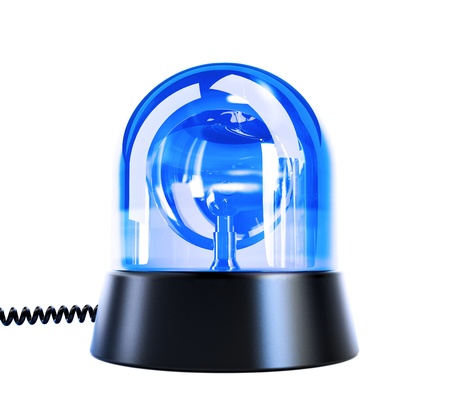 A close-up shot of a blue rotating beacon light, often used for emergency vehicles or industrial signaling, isolated on a seamless white surface.