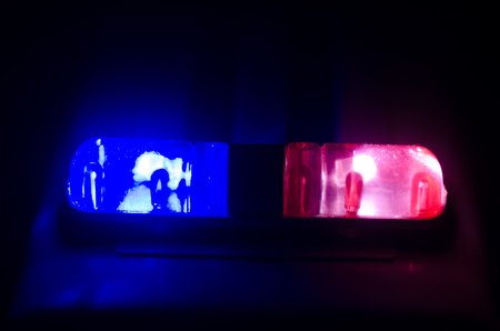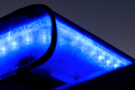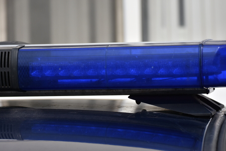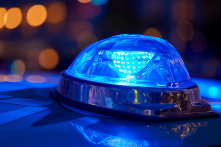 Close-up of a glowing blue police siren on a patrol car with bokeh lights in the background