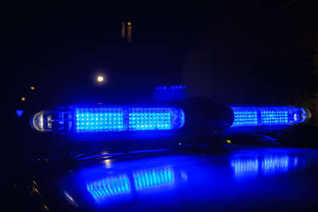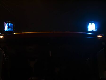 Blue flasher on the police car at night. Police car in action. Police car with blue lights at night. selective focus
