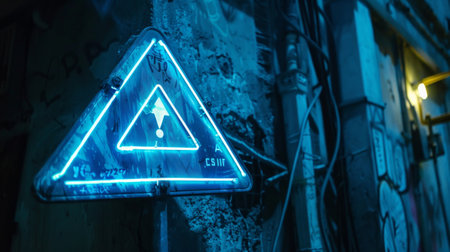 Triangular neon road sign attention with exclamation mark from post-apocalypse or horror movie era.