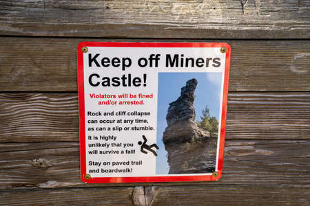 Michigan, USA - October 19, 2021: Sign warning to keep off Miners Castle rock formation along Lake Superior, at Pictured Rocks National Lakeshore Michigan