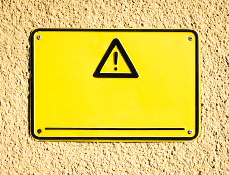 A close-up of a bright yellow diamond-shaped warning sign featuring a bold black exclamation mark, indicating caution or danger.