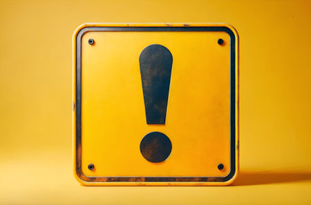 A bright yellow warning sign with a bold exclamation mark, placed on a clean black background.