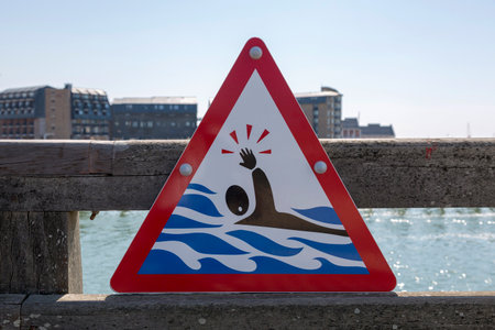 Warning label about the death of fish in the pond. Poisoned water in the lake.