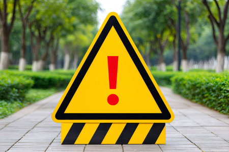 Yellow triangular warning sign with red exclamation mark standing on a pedestrian path