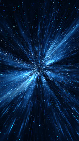 Hyperspace abstract depicts high-speed interstellar travel. The streaking blue light forms a vibrant, energetic pattern, suggesting speed and limitless distance. Digital rendering in vertical format.