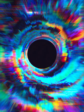 A dazzling swirl of luminous hues spirals outward, creating a dynamic sense of motion and mystique around a mysterious dark center.