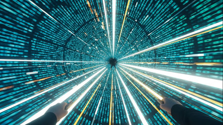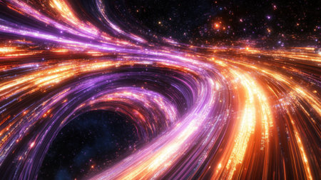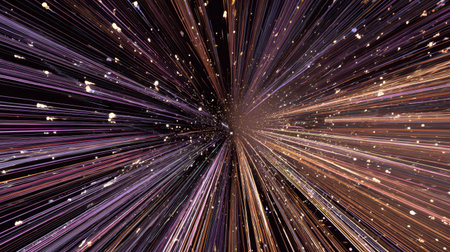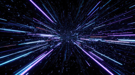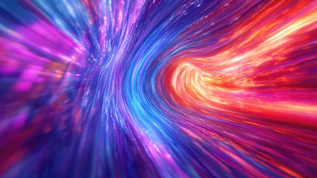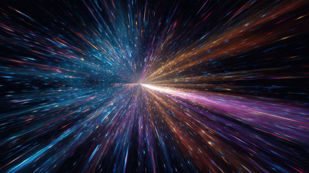 This captivating abstract image depicts a dynamic visualization of light speed travel, featuring vivid colors and bright light streaks against a dark backdrop.