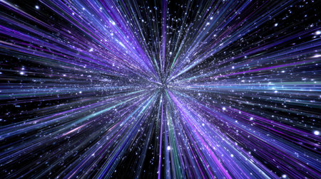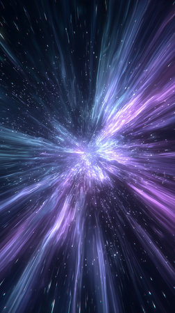 Explore an abstract cosmic journey filled with vibrant light beams and shimmering particles, evoking a sense of speed and infinite possibilities in dark space.
