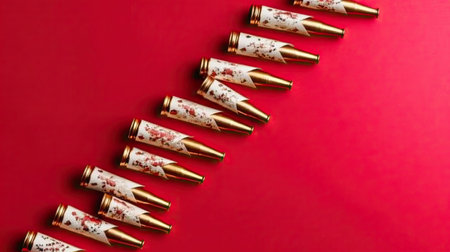 Pastel red background with white triangular shapes and golden cannon icons arranged diagonally --chaos 12 --ar 16:9 --weird 150 --v 6.1 Job ID: 941f6d13-6a8c-4b82-91b9-a891e0dc24b9