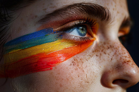 Female eyes close-up on the face with bright spots of multi-colored paint. Banner
