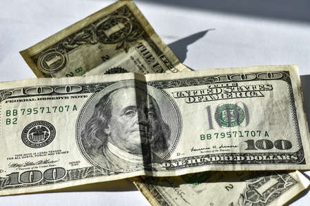 Old one hundred dollar and one dollar bills lie on white background, the concept of inflation