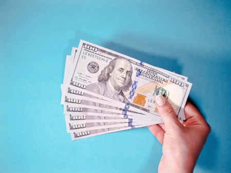 Business woman counting money in hands. Handful of money. Offering money. Women's hands hold money denominations of 100 dollars. Cash out money. Credit concept.
