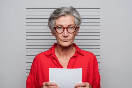 A police mugshot of a serious-looking senior woman with gray hair and glasses, wearing a red shirt and holding a blank white card for identification.