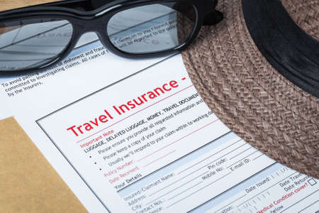 Travel Insurance Claim application form and hat with eyeglass on brown envelope, business insurance and risk concept; document is mock-up