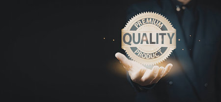 A hand holding a golden seal that reads 'Premium Quality Product' against a dark background, emphasizing quality and excellence.