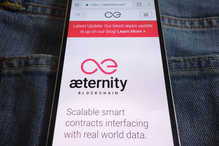 KONSKIE, POLAND - JUNE 02, 2018: Aeternity blockchain website displayed on smartphone hidden in jeans pocket