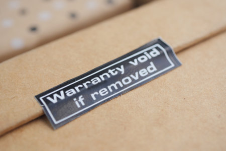 Warranty label on a sealed cardboard box in storage area