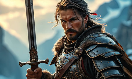 A fierce warrior stands with a sword, embodying strength and courage. The dramatic landscape sets the stage for an epic adventure, capturing history and valor.