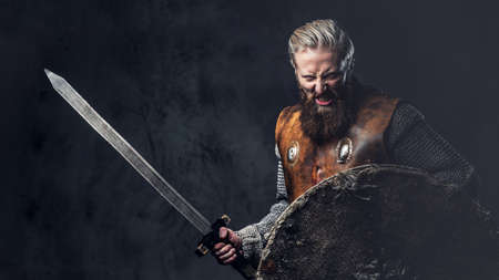 Viking dressed in Nordic armor holds a shield and silver sword.