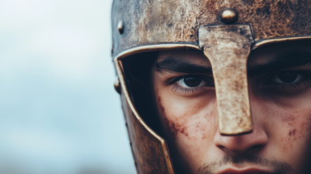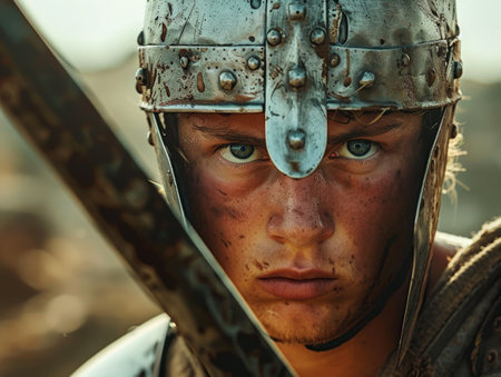 Intense Gaze of a Warrior in Rustic Medieval Helmet.