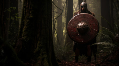 Emerging Spartan warrior from forest lambda shield glows in eerie light