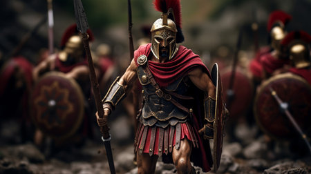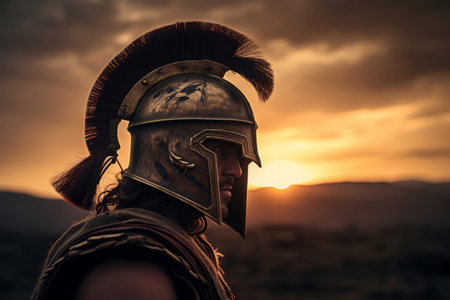 Spartan warrior portrait. Roman ancient helmet empire combat legend. Generate Ai