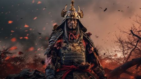 A focused samurai warrior in traditional armor stands in front of a glowing sunset, symbolizing honor, strength, and resilience.