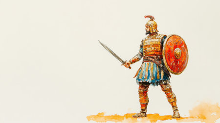 A fierce warrior stands in a confident pose, holding a sword in one hand and a shield in the other. His armor reflects a rich history, complete with intricate details and colors.