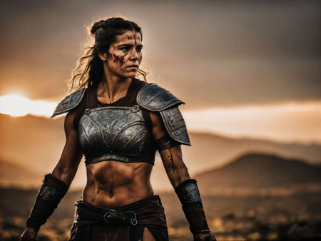 photo of strong ancient young female warrior with roman armor stained, generative AI