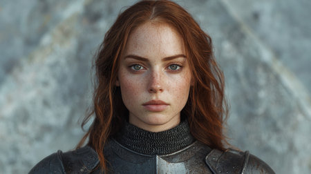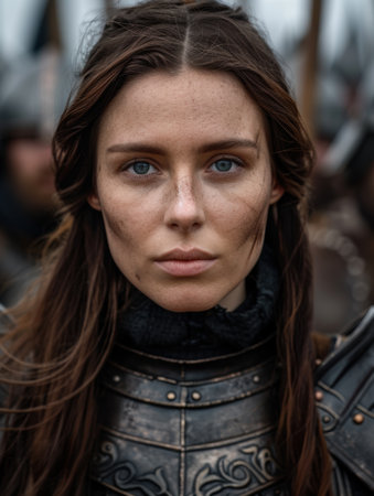 Determined female warrior in armor with a solemn expression