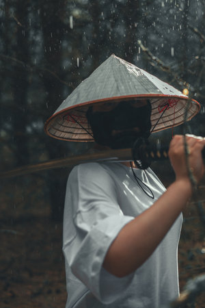 A strong man with a katana in his hands stands in the dark forest during the rain. A man in a black protective mask and a straw hat depicts a samurai holding a katana in the forest in the rain.
