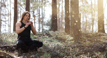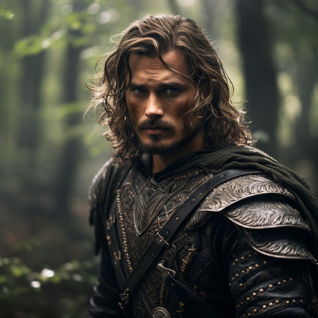 Portrait of a medieval knight with a sword in his hands. Fantasy forest.