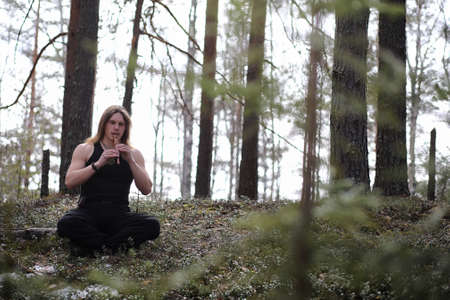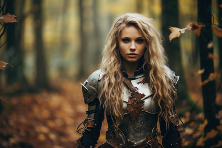 Sideview shot of a majestic, beautiful noble woman in a thick forest with a magic sword in her hands. Scandinavian mythology. Ancient legends.