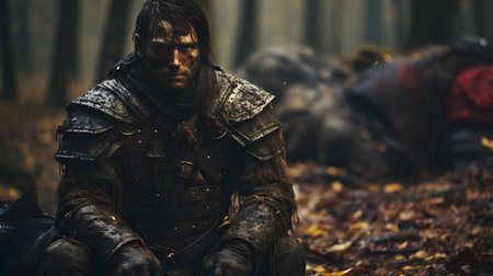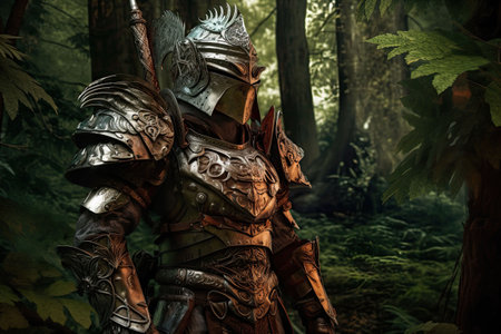 Fantasy knight with old armor in the ancient forest. Generative AI illustration