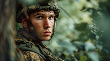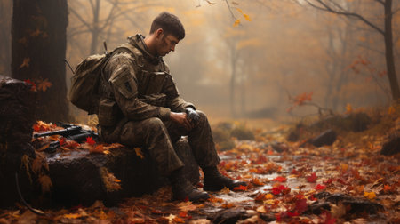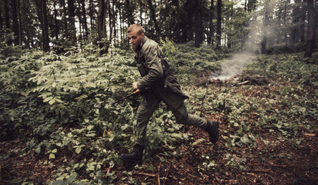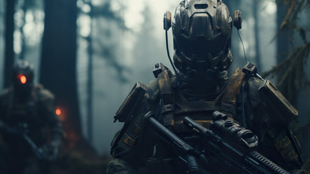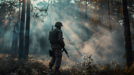 A modern warfare soldier on war duty in dense and dangerous forest areas. Dangerous military rescue operations