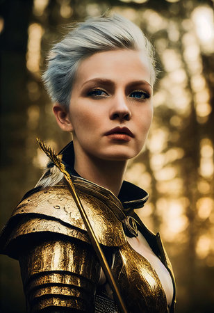 A fictional person, not based on a real person. Portrait of an ancient female warrior in ancient warrior armor. The concept of an ancient brave warrior. 3D render.