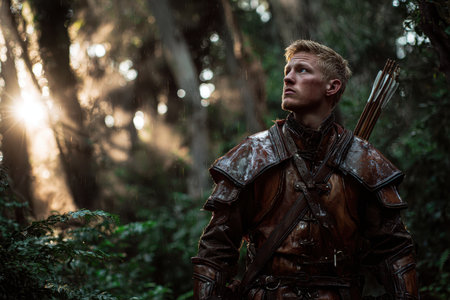 A dramatic portrait of a medieval archer standing in a forest during rain. AI-generated.