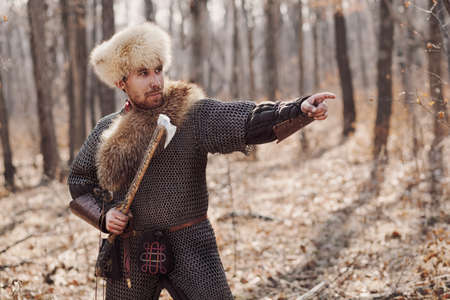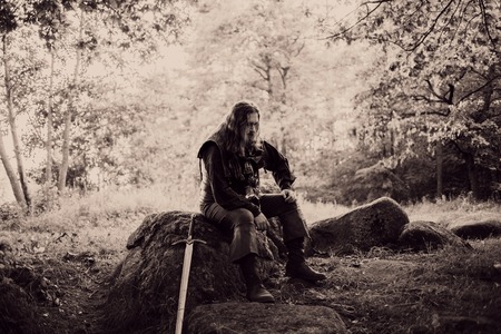 Brutal viking warrior sits on the ground before his mighty sword, scandinavian ancient warrior