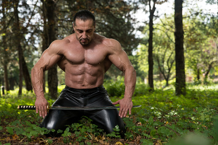 Action Hero Muscled Man Holding A Ancient Sword - Standing In Forest Wearing Leather Pants