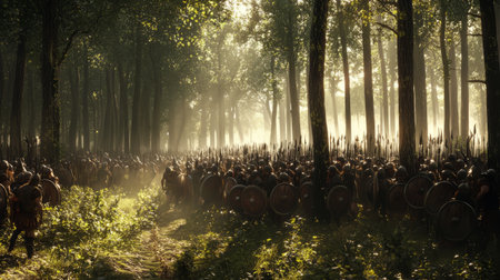 Tribes Ambush formation from dense forests, waiting to strike a marching column. Generative AI