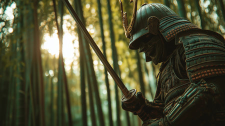 A samurai warrior, clad in intricate armor, stands contemplatively in a serene bamboo grove