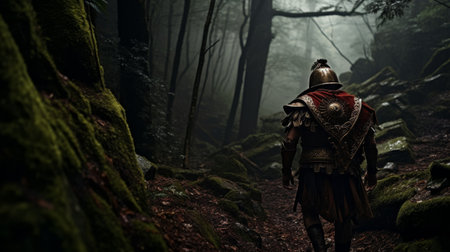 An AI-generated illustration of A warrior on a trail in a dark wooded area