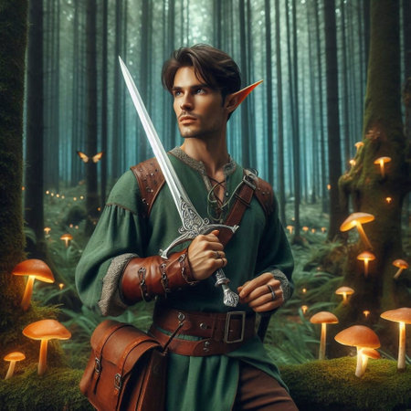 A portrait of a man dressed in fantasy attire standing amidst towering pine trees mystical forest