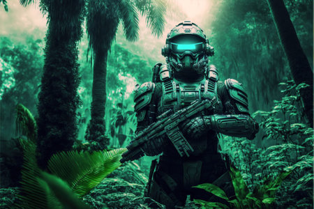 Soldier in jungle on alien planet, man with futuristic military equipment in forest, generative AI. Warrior in helmet holds weapon in rainforest, concept of uniform, future and star wars.