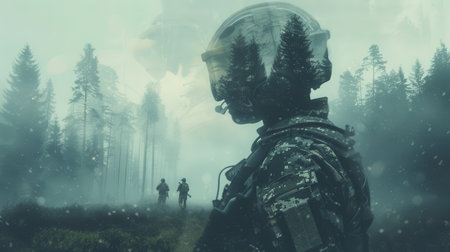 A soldier wearing camouflage and a helmet stands in a foggy forest, looking off to the side. The soldier is facing away from the camera, and there are other soldiers walking in the distance.