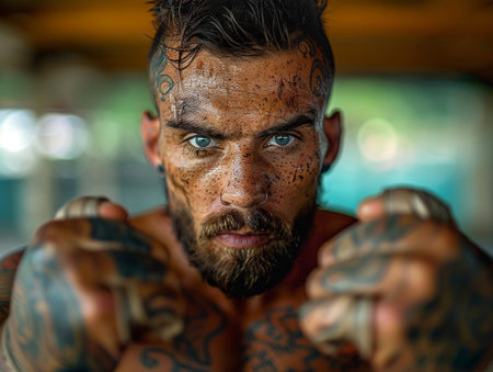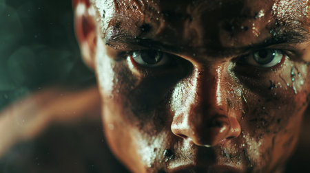 close-up portrait of a fighter in the ring, his intense gaze capturing the moment before the battle.